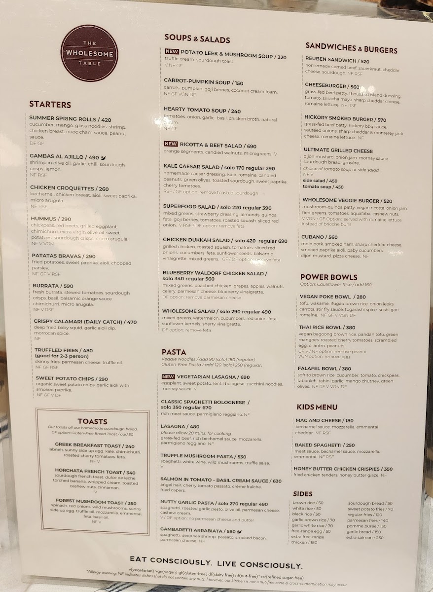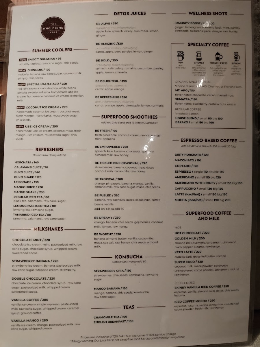 From a reviewer’s perspective, the menu at The Wholesome Table Shangri-La Plaza offers a thoughtfully curated mix of health-focused and comfort dishes, though the absence of clearly listed prices leaves some curiosity for diners. The variety stands out, from hearty brunch options like the Full English Breakfast and Bistek Tagalog Brown Rice to nourishing choices such as the Buddha Bowl White Rice, Cauliflower Rice, and Chicken Teriyaki Bowl Brown Rice. Lighter fare like the Forest Mushroom Toast and Greek Breakfast Toast, alongside snacks such as Sweet Potato Chips and Chicken Croquettes, balance indulgence with wellness. Their beverage lineup-from detox juices like Be Alive and Be Amazing to smoothies like Be Dreamy and Be Tickled Pink, plus milkshakes such as the Strawberry Banana Milkshake and Double Chocolate Milkshake-adds a refreshing dimension. Desserts and baked goods, including Chia Berry Muffin, Blueberry Muffin, and whole or sliced cakes, round out the experience. Overall, the menu reflects a modern, health-conscious dining philosophy with diverse options, even if clearer pricing would enhance transparency for guests.